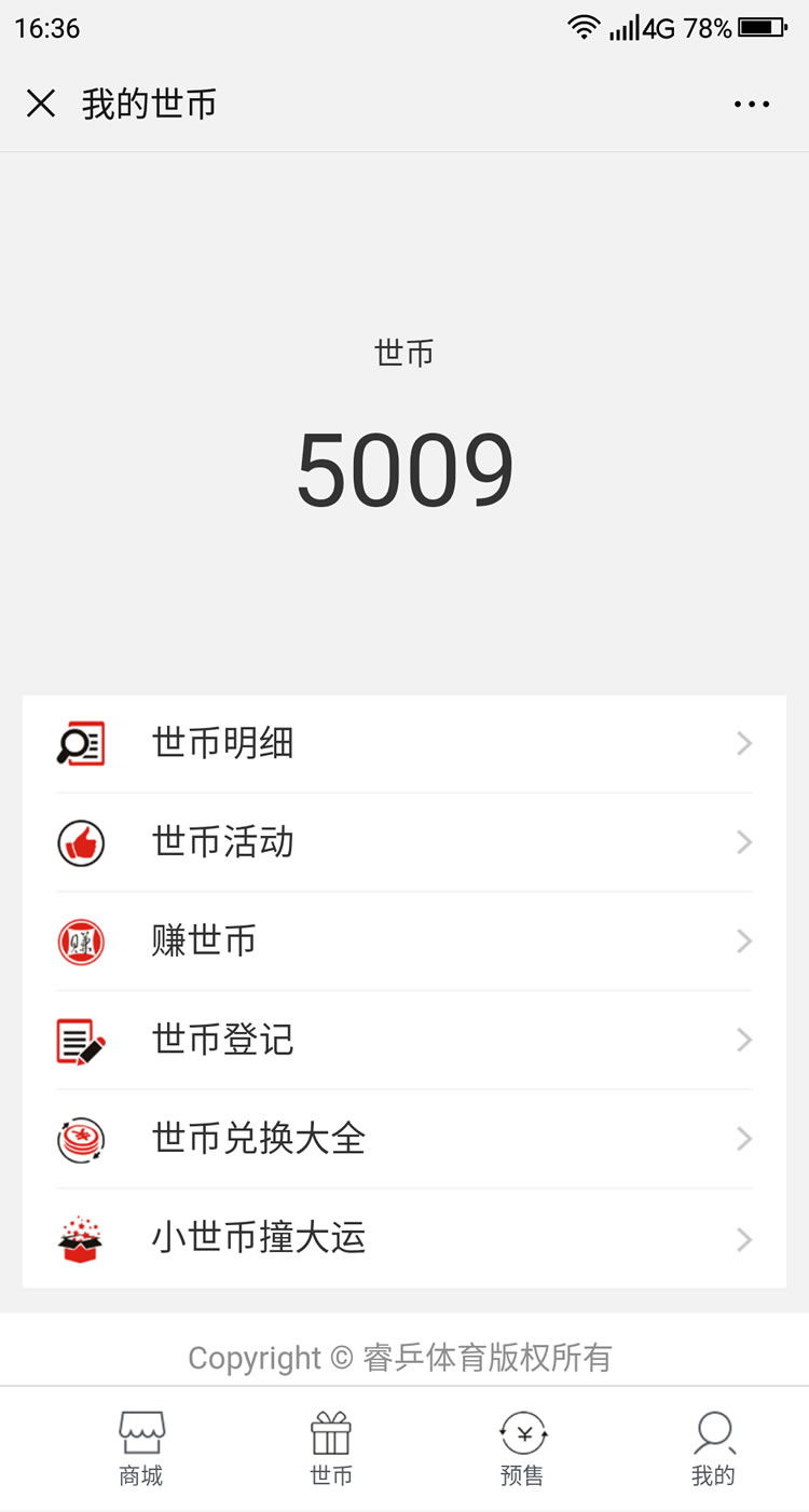 睿乒体育公众号平台-主要功能:器材商城、预售、定制、报名、证书查询、世币商城、福利中心、睿币商城、世币抽奖,签到等功能。