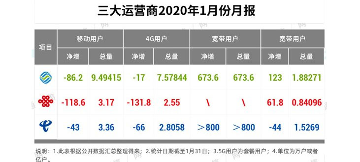 虽然尚未全面复工,但是三大运营商都如期公布了2020开年的经营数据。除了中国联通告别持续多个月份的用户“双降”,中国电信开启连续的固网宽带负增长之外,其他的情况与大家预期的基本相符。