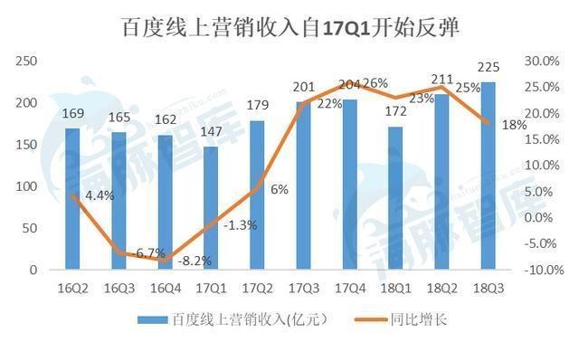 百度自2016年开始布局信息流业务,并在2017年开始获得回报。财报显示,其线上营销(广告业务)增速在16Q4跌至谷底的-8.2%。随后在17Q1反弹至-1.3%。终于在17Q2重回正增长,增速为6%。后续的几个季度,百度线上营收增速始终维持在20%上下。